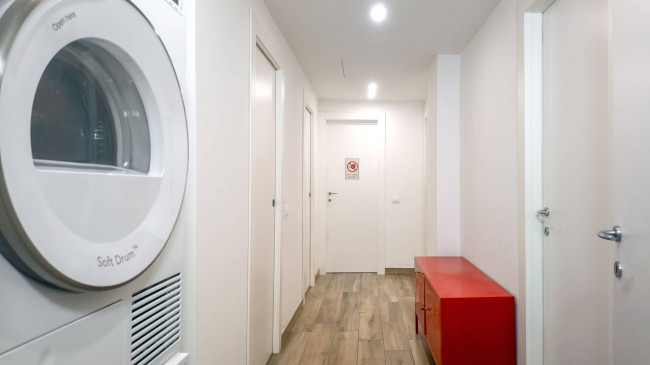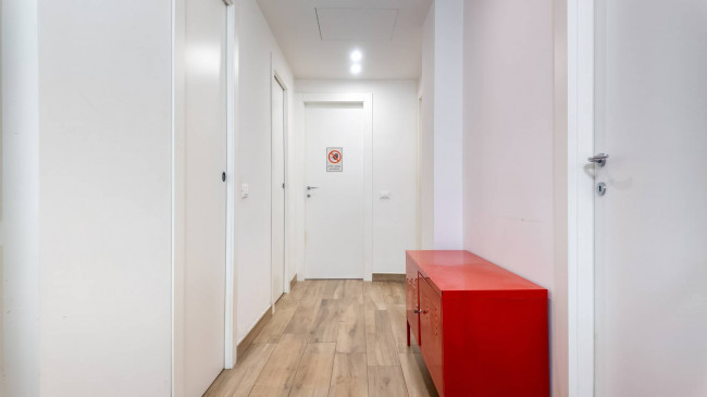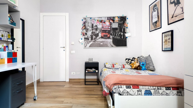 La zona notte è composta da due camere matrimoniali, una camera singola di ampia metratura, ideale anche come studio o stanza ospiti, e due bagni finestrati con box doccia. Un ampio corridoio completamente soppalcato collega armoniosamente gli ambienti, offrendo ulteriore spazio contenitivo, affiancato da un grande ripostiglio e da una comoda zona lavanderia.
