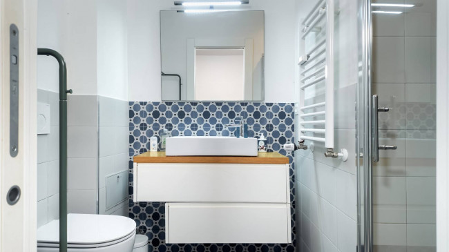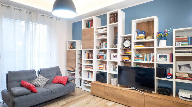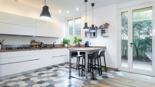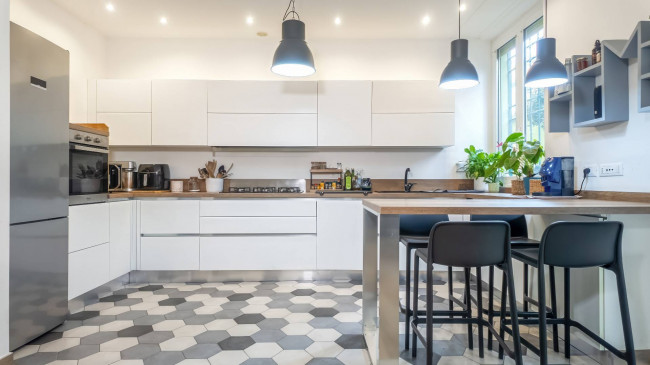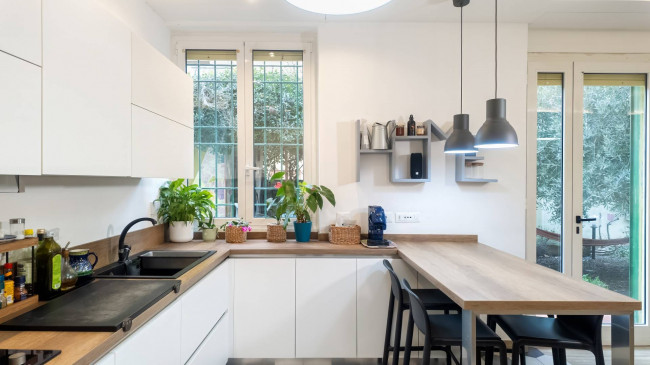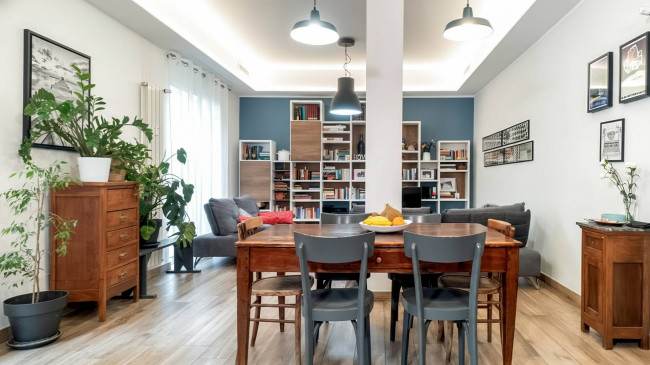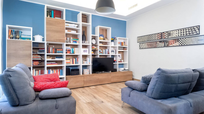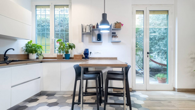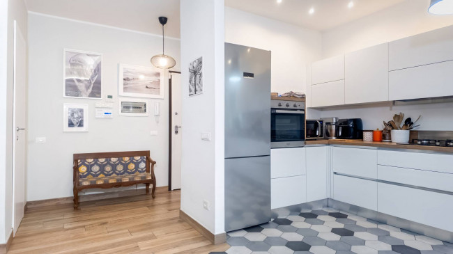 L'ingresso conduce a un salone abitabile luminoso, perfettamente integrato con la cucina a vista, creando un ambiente conviviale e contemporaneo.