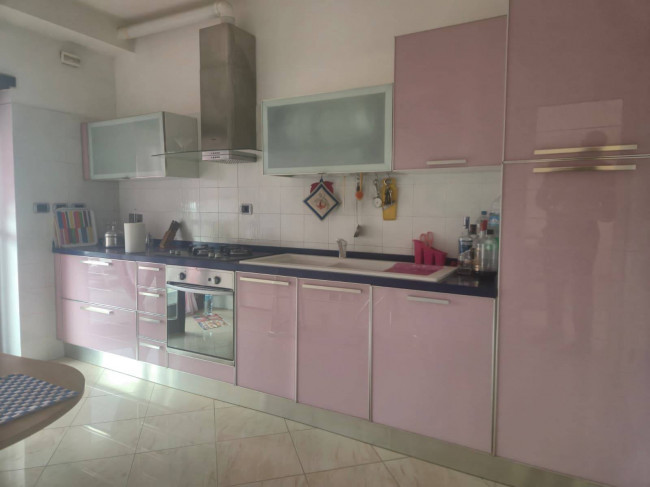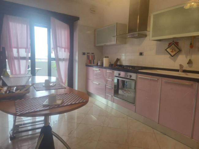 una deliziosa cucina abitabile preziosamente arredata da mobili di Veneta Cucina in vetro rosa con ripostiglio annesso.