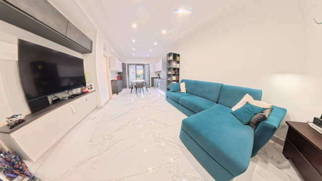 Ingresso che conduce ad un ampia zona giorno impreziosita da un angolo cottura moderno e funzionale, completamente nuovo.